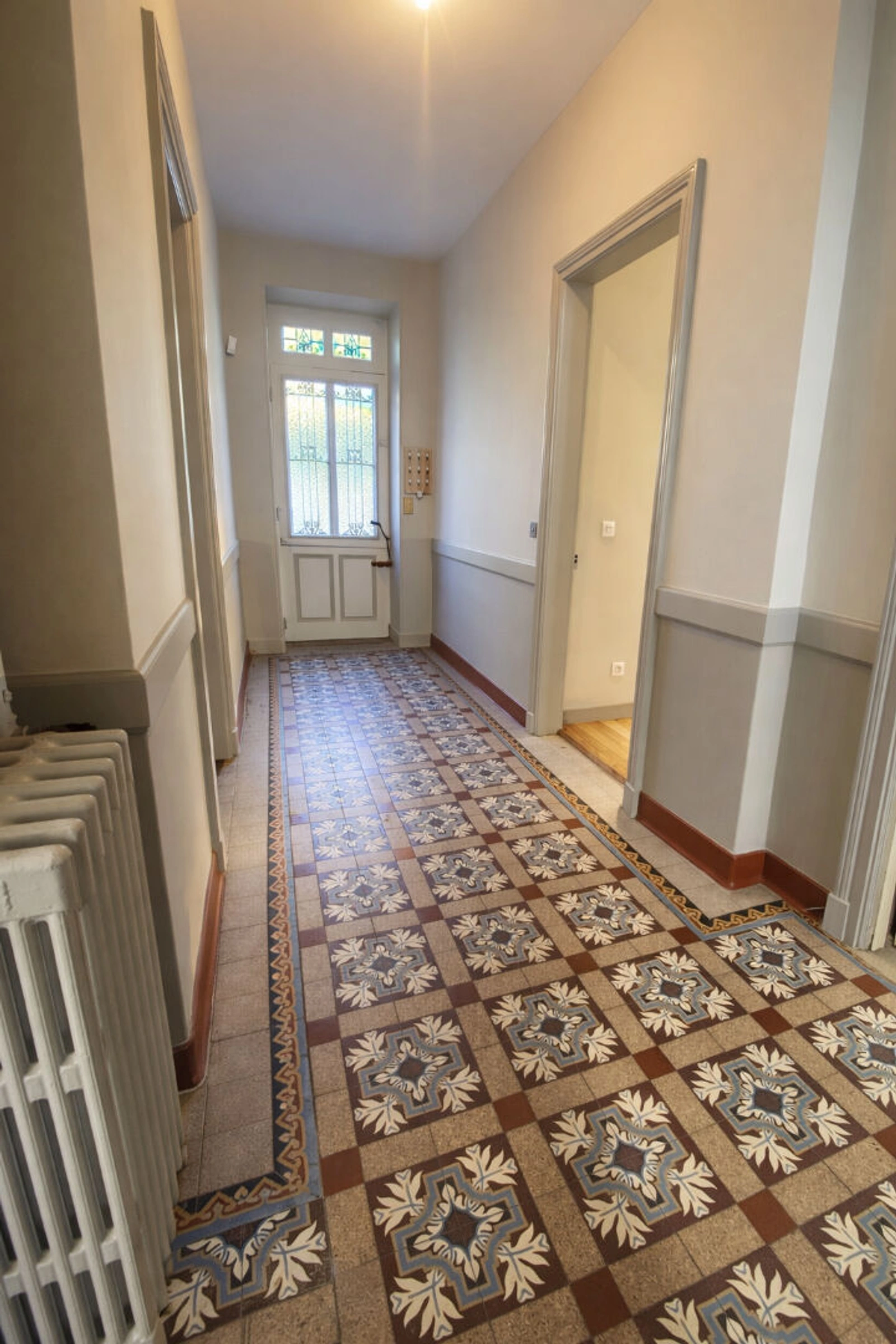 Dés l'entrée, le ton est donné : authentiques carreaux de ciment , parquets anciens parfaitement conservés, moulures raffinées, remarquables hauteurs sous plafonds composent un décor d'une élégance rare .
